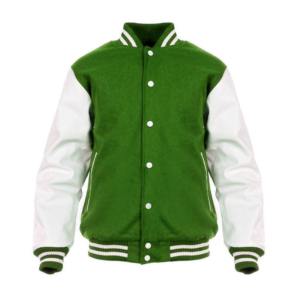 Varsity jackets are classic, sporty jackets featuring a wool or fabric body with contrasting leather or faux-leather sleeves. They typically have ribbed cuffs, collars, and hems, and are often adorned with letters, patches, or team insignias. Combining warmth, durability, and style, varsity jackets are popular for casual wear and school or team pride.